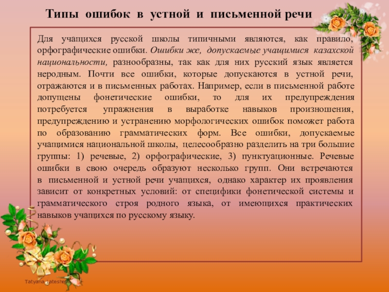 являются, как правило, орфографические ошибки. Ошибки же, допускаемые учащимися казахской национальности, разнообразны, так как для них русский язык является неродным. Почти все ошибки, которые допускаются в устной речи, отражаются и в письменных работах. Например, если в письменной работе допущены фонетические ошибки, то для их предупреждения потребуется упражнения в выработке навыков произношения, предупреждению и устранению морфологических ошибок поможет работа по образованию грамматических форм. Все ошибки, допускаемые учащимися национальной школы, целесообразно разделить на три большие группы: 1) речевые, 2) орфографические, 3) пунктуационные. Речевые ошибки в свою очередь образуют несколько групп. Они встречаются в письменной и устной речи учащихся, однако характер их проявления зависит от конкретных условий: от специфики фонетической системы и грамматического строя родного языка, от имеющихся практических навыков учащихся по русскому языку.