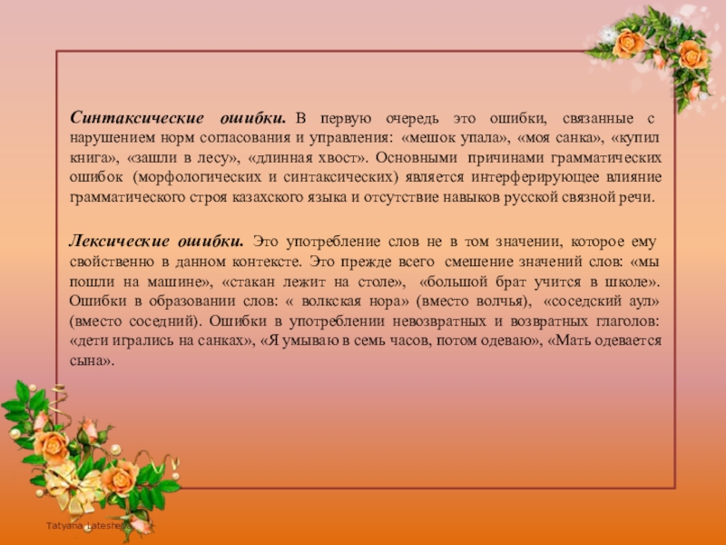 и управления: «мешок упала», «моя санка», «купил книга», «зашли в лесу», «длинная хвост». Основными причинами грамматических ошибок (морфологических и синтаксических) является интерферирующее влияние грамматического строя казахского языка и отсутствие навыков русской связной речи.