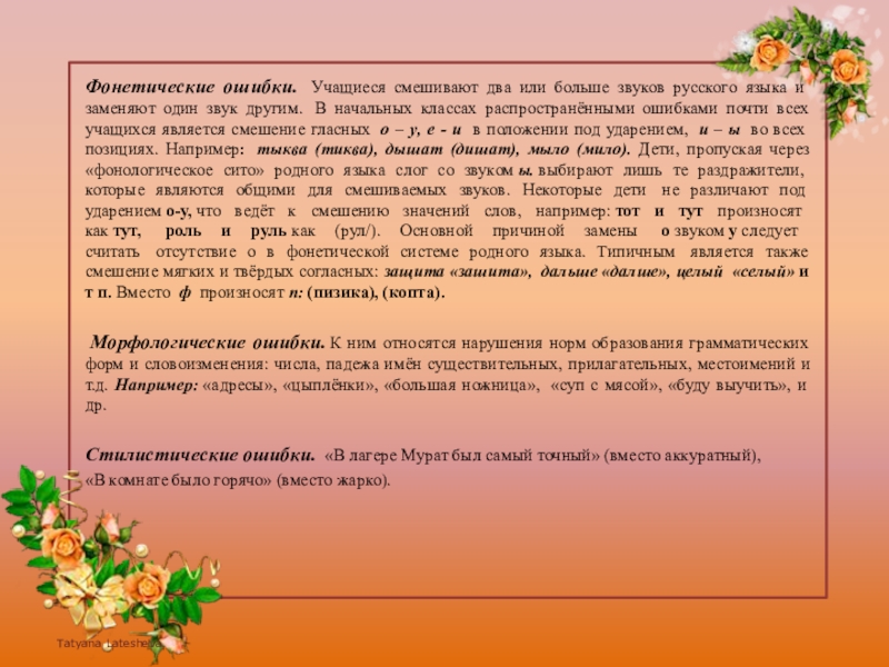 Слайд 12Фонетические ошибки. Учащиеся смешивают два или больше звуков русского языка и