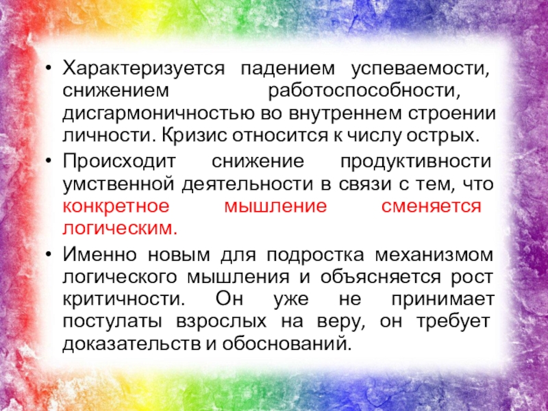 Слайд 3Характеризуется падением успеваемости, снижением работоспособности, дисгармоничностью во внутреннем строении личности. Кризис