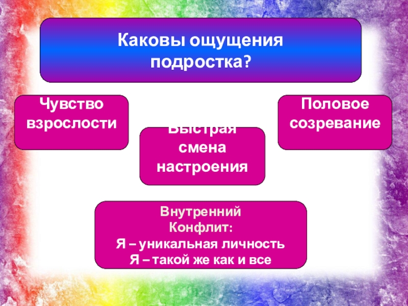 подростка и проявляющийся «рывком роста». Ребенок вынужден постоянно приспосабливаться к изменениям в своем организме. Формируется новый образ физического «Я».