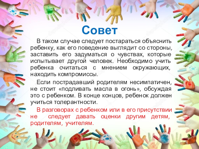 В разговорах с ребенком или в его присутствии не следует давать оценки другим детям, родителям, учителям.