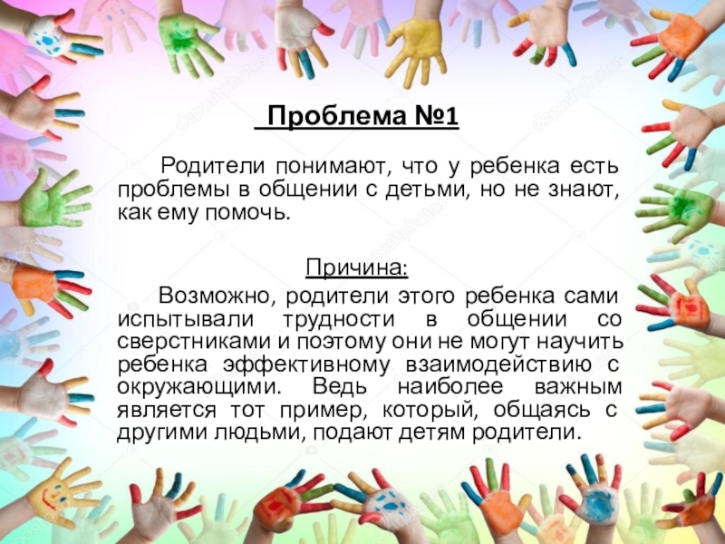 Возможно, родители этого ребенка сами испытывали трудности в общении со сверстниками и поэтому они не могут научить ребенка эффективному взаимодействию с окружающими. Ведь наиболее важным является тот пример, который, общаясь с другими людьми, подают детям родители.