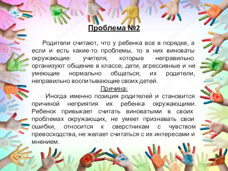 порядке, а если и есть какие-то проблемы, то в них виноваты окружающие: учителя, которые неправильно организуют общение в классе; дети, агрессивные и не умеющие нормально общаться; их родители, неправильно воспитывающие своих детей.
