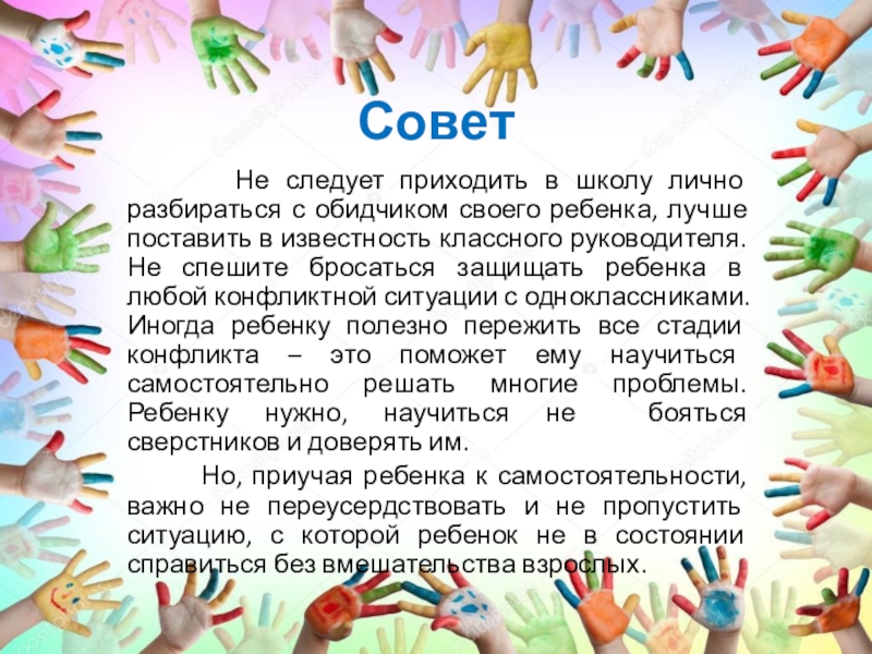 лично разбираться с обидчиком своего ребенка, лучше поставить в известность классного руководителя. Не спешите бросаться защищать ребенка в любой конфликтной ситуации с одноклассниками. Иногда ребенку полезно пережить все стадии конфликта – это поможет ему научиться самостоятельно решать многие проблемы. Ребенку нужно, научиться не бояться сверстников и доверять им.