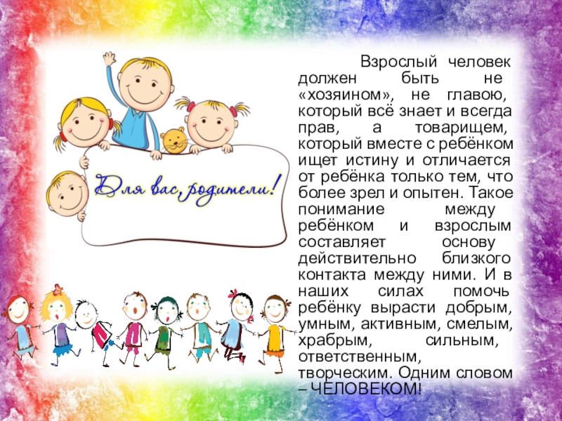 главою, который всё знает и всегда прав, а товарищем, который вместе с ребёнком ищет истину и отличается от ребёнка только тем, что более зрел и опытен. Такое понимание между ребёнком и взрослым составляет основу действительно близкого контакта между ними. И в наших силах помочь ребёнку вырасти добрым, умным, активным, смелым, храбрым, сильным, ответственным, творческим. Одним словом – ЧЕЛОВЕКОМ!