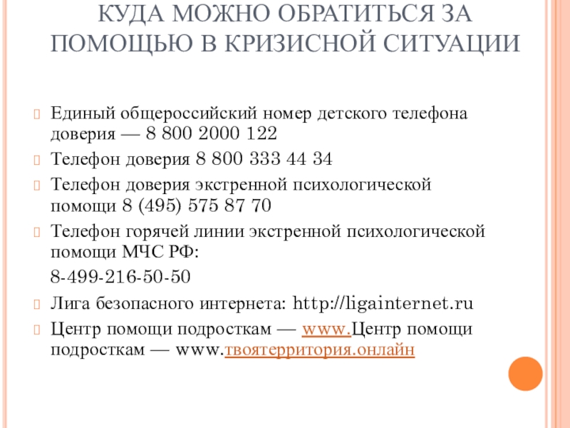 Слайд 39Телефон горячей линии экстренной психологической помощи МЧС РФ: