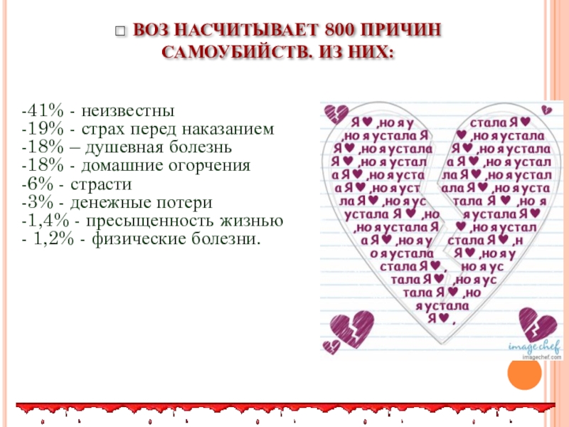 Слайд 14□ ВОЗ НАСЧИТЫВАЕТ 800 ПРИЧИН САМОУБИЙСТВ. ИЗ НИХ: