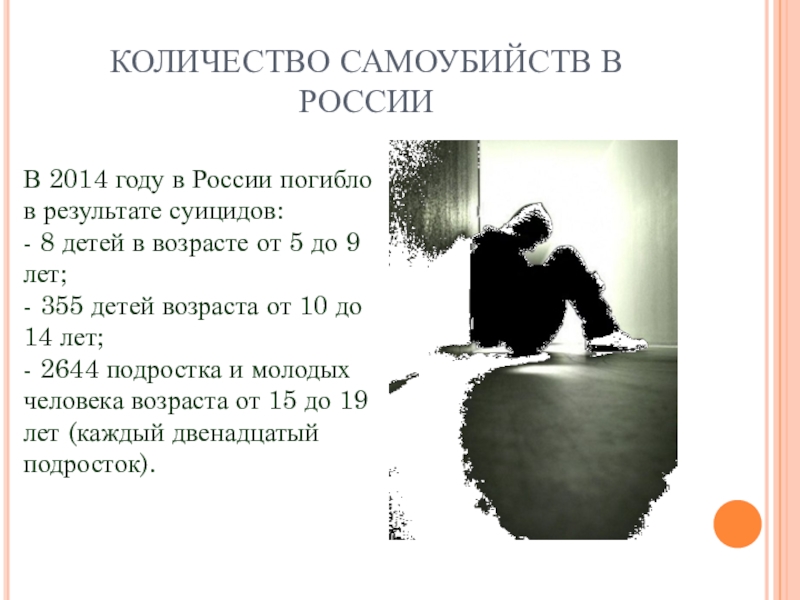 Слайд 8КОЛИЧЕСТВО САМОУБИЙСТВ В РОССИИ