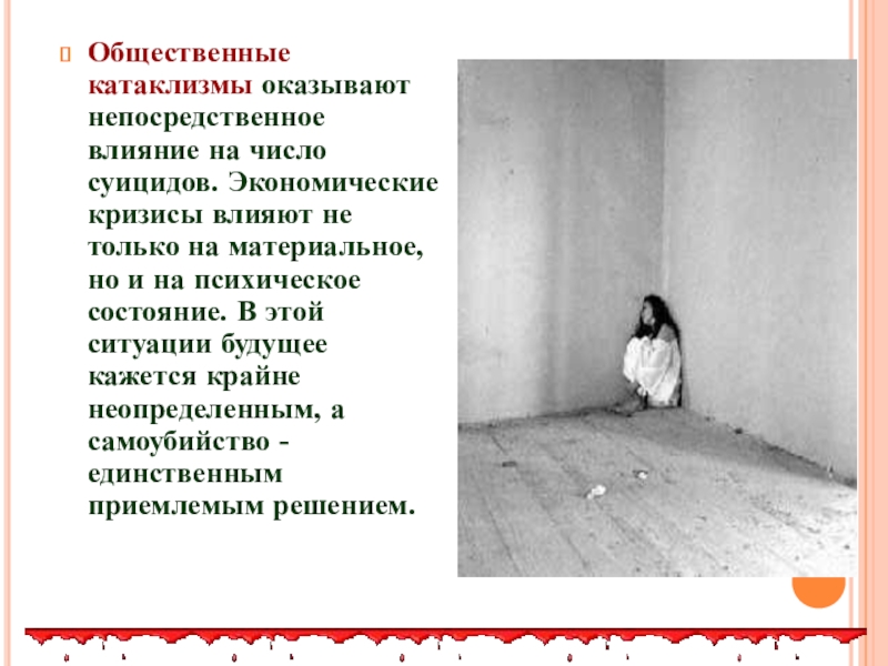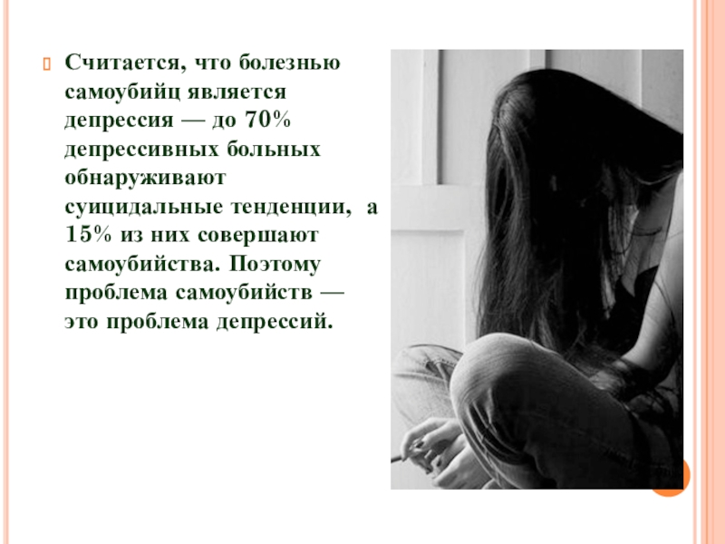 Слайд 15Считается, что болезнью самоубийц является депрессия — до 70% депрессивных больных