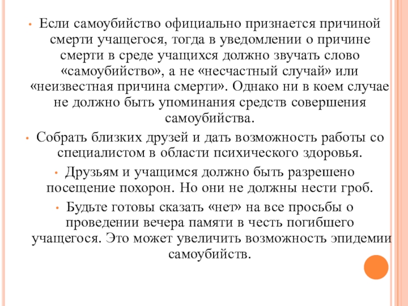 причине смерти в среде учащихся должно звучать слово «самоубийство», а не «несчастный случай» или «неизвестная причина смерти». Однако ни в коем случае не должно быть упоминания средств совершения самоубийства.