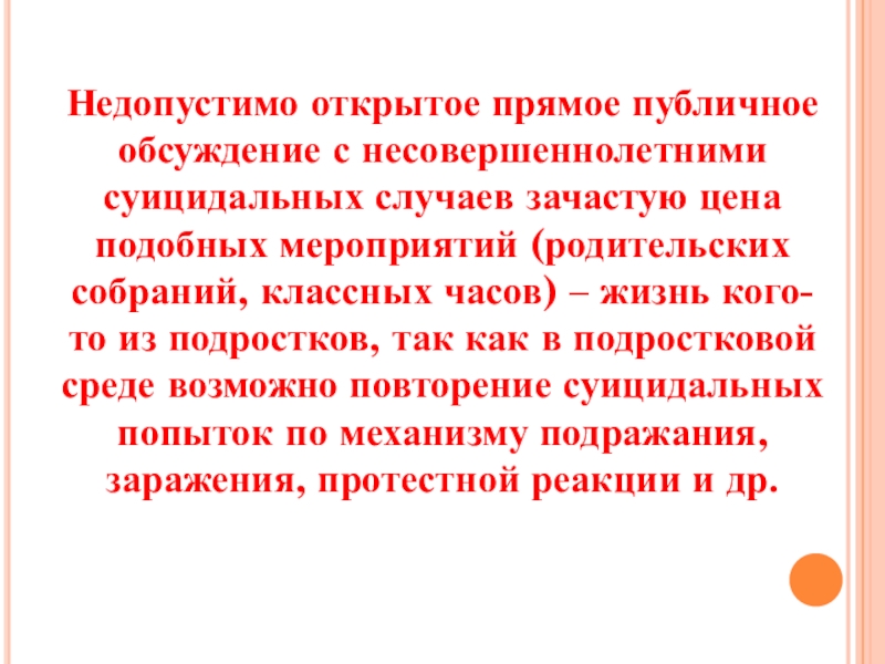 Слайд 35Недопустимо открытое прямое публичное обсуждение с несовершеннолетними суицидальных случаев зачастую цена