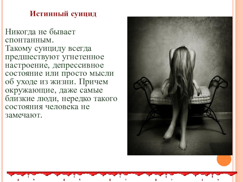 Такому суициду всегда предшествуют угнетенное настроение, депрессивное