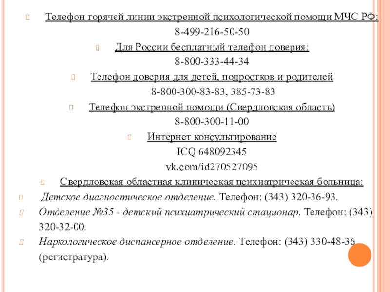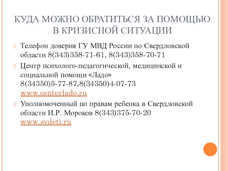 Слайд 44Телефон доверия ГУ МВД России по Свердловской области 8(343)358-71-61, 8(343)358-70-71