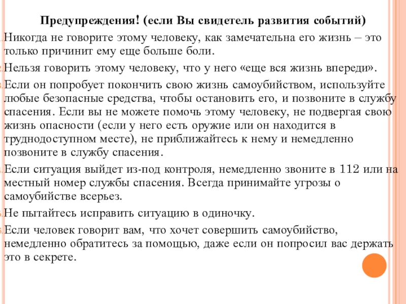 Если человек говорит вам, что хочет совершить самоубийство, немедленно обратитесь за помощью, даже если он попросил вас держать это в секрете.