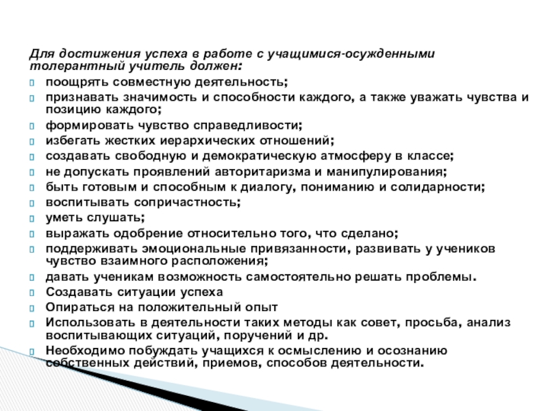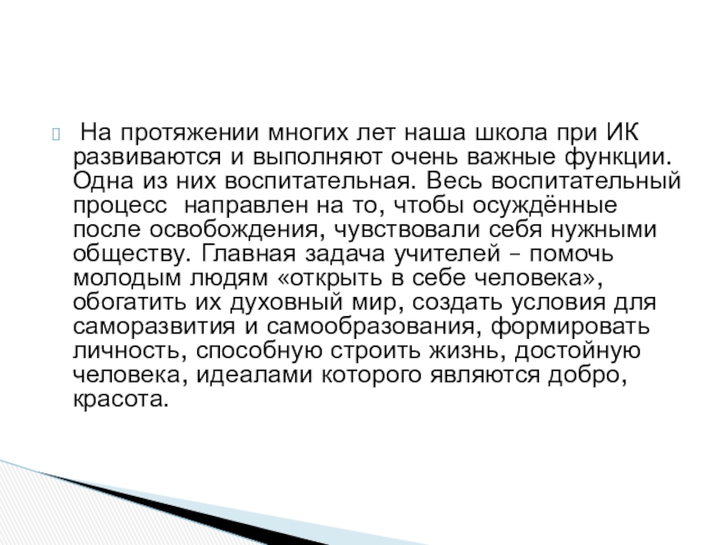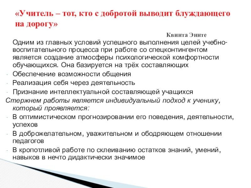 Одним из главных условий успешного выполнения целей учебно-воспитательного процесса при работе со спецконтингентом является создание атмосферы психологической комфортности обучающихся. Она базируется на трёх составляющих