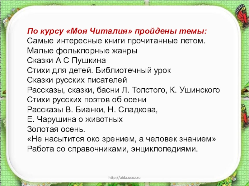*http://aida.ucoz.ruПо курсу «Моя Читалия» пройдены темы:Самые интересные книги прочитанные летом.Малые фольклорные жанрыСказки А С ПушкинаСтихи для детей.