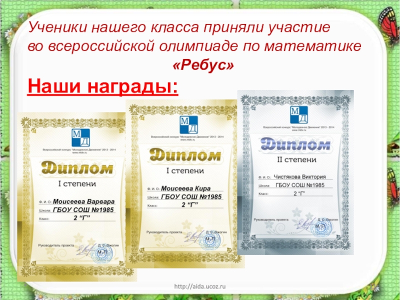 *http://aida.ucoz.ruУченики нашего класса приняли участие во всероссийской олимпиаде по математике«Ребус»Наши награды: