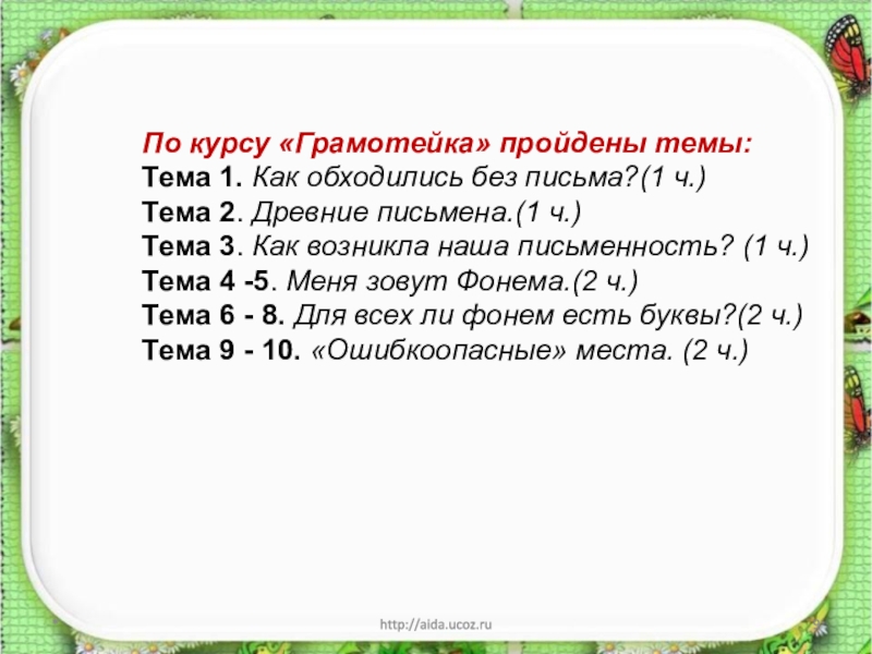 *http://aida.ucoz.ruПо курсу «Грамотейка» пройдены темы:Тема 1. Как обходились без письма?(1 ч.)      Тема 2. Древние письмена.(1 ч.)Тема 3. Как
