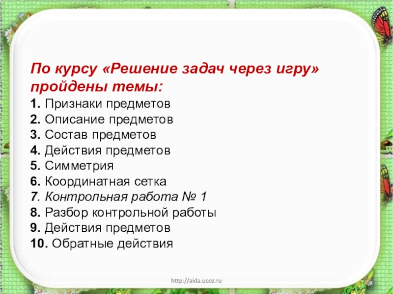 *http://aida.ucoz.ruПо курсу «Решение задач через игру» пройдены темы:1. Признаки предметов2. Описание предметов3. Состав предметов4. Действия предметов5. Симметрия6.