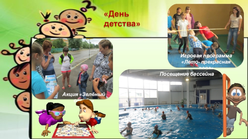 Игровая программа «Лето- прекрасная пора»Акция «Зелёный огонёк»Посещение бассейна«День детства»