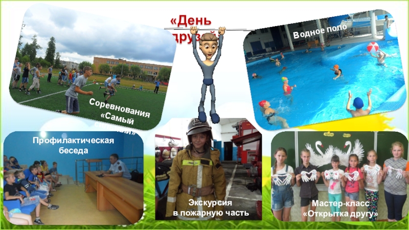 «День друзей»Водное полоПрофилактическая беседаСоревнования «Самый сильный»Мастер-класс «Открытка другу»Экскурсия в пожарную часть