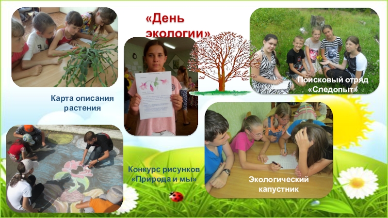 «День экологии»Поисковый отряд «Следопыт»Экологический капустникКонкурс рисунков «Природа и мы»Карта описания растения