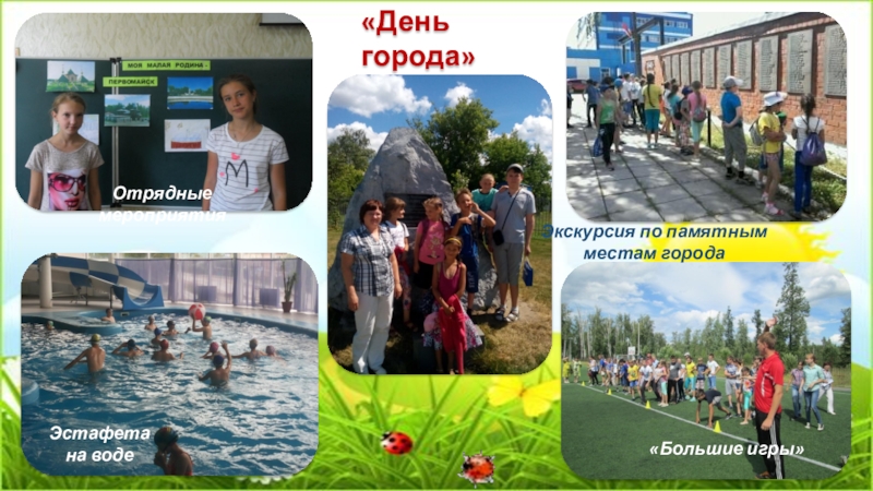 «День города»«Большие игры»Эстафета на водеЭкскурсия по памятным местам городаОтрядные мероприятия
