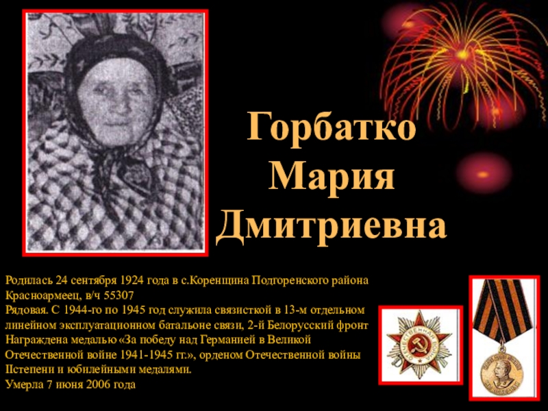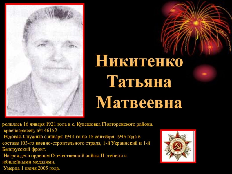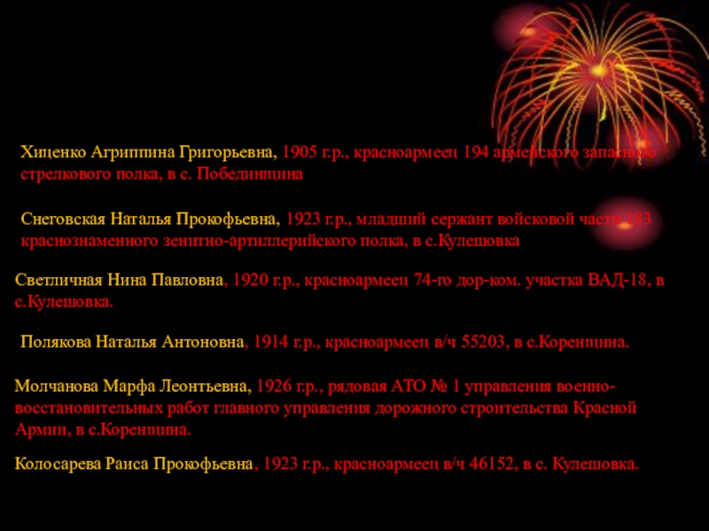 Светличная Нина Павловна, 1920 г.р., красноармеец 74-го дор-ком. участка ВАД-18, в с.Кулешовка.