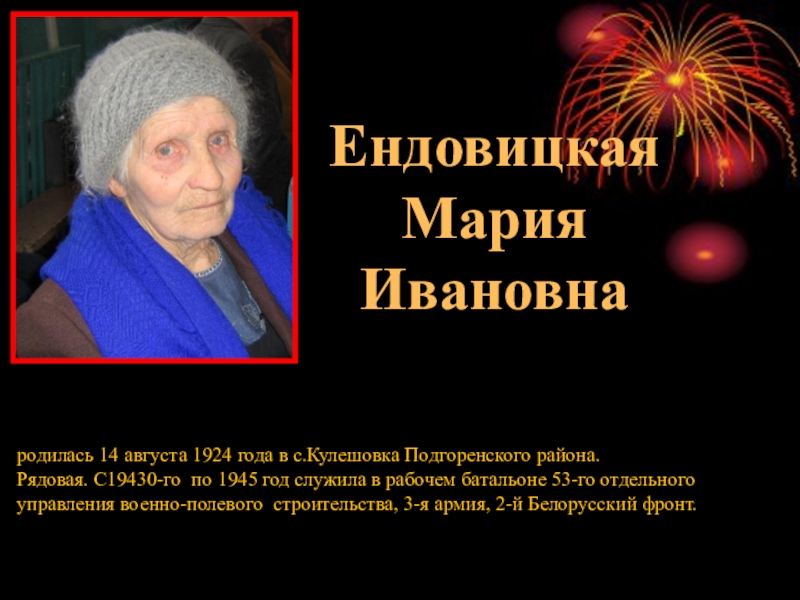 Молчанова Марфа Леонтьевна, 1926 г.р., рядовая АТО № 1 управления военно-восстановительных работ главного управления дорожного строительства Красной Армии, в с.Коренщина.