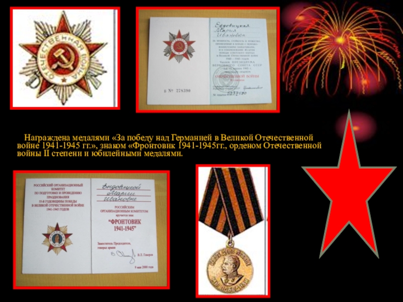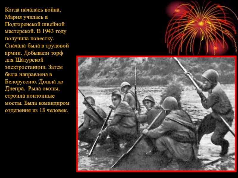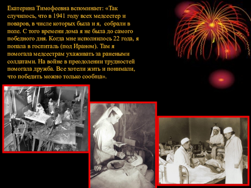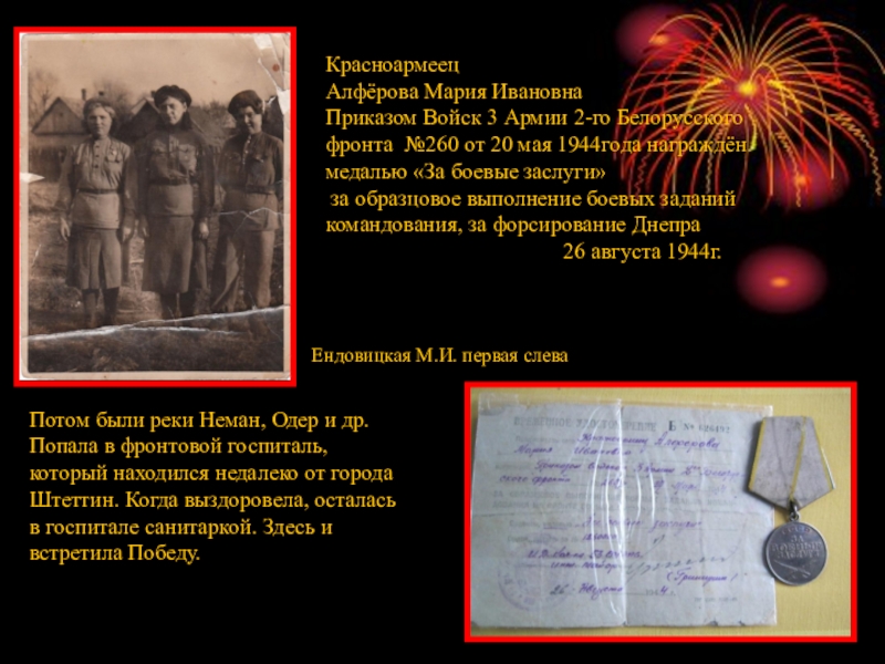 Потом были реки Неман, Одер и др. Попала в фронтовой госпиталь, который находился недалеко от города Штеттин. Когда выздоровела, осталась в госпитале санитаркой. Здесь и встретила Победу.
