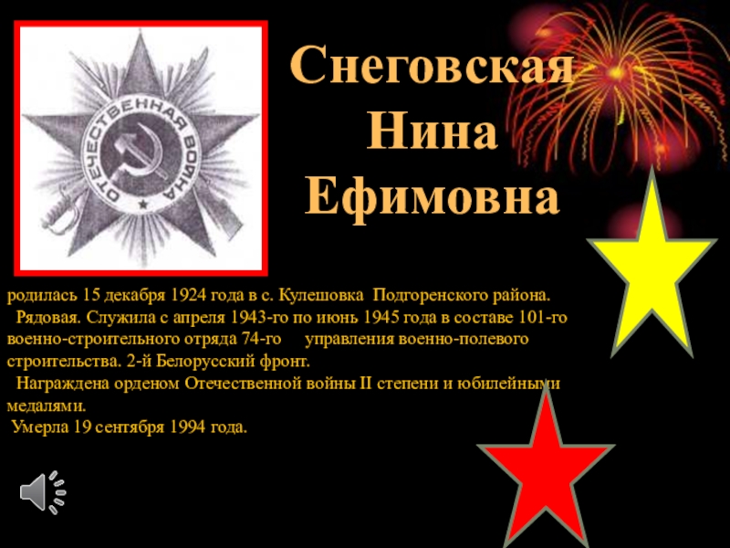 Снеговская Наталья Прокофьевна, 1923 г.р., младший сержант войсковой части 183 краснознаменного зенитно-артиллерийского полка, в с.Кулешовка