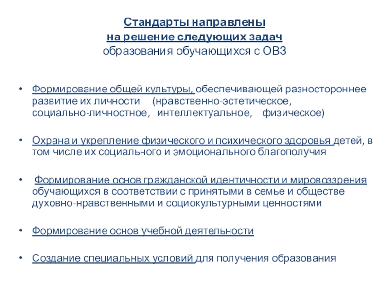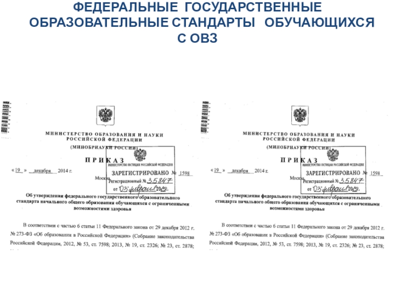 Слайд 4ФЕДЕРАЛЬНЫЕ ГОСУДАРСТВЕННЫЕ ОБРАЗОВАТЕЛЬНЫЕ СТАНДАРТЫ ОБУЧАЮЩИХСЯ С ОВЗ