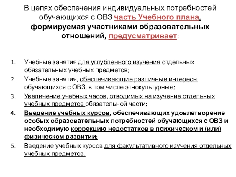 Слайд 39В целях обеспечения индивидуальных потребностей обучающихся с ОВЗ часть Учебного плана,