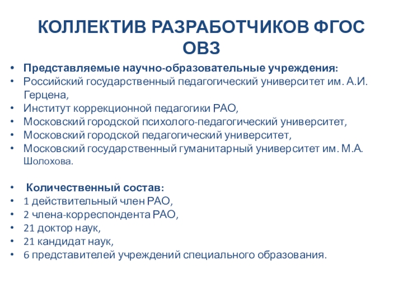 Слайд 3КОЛЛЕКТИВ РАЗРАБОТЧИКОВ ФГОС ОВЗ