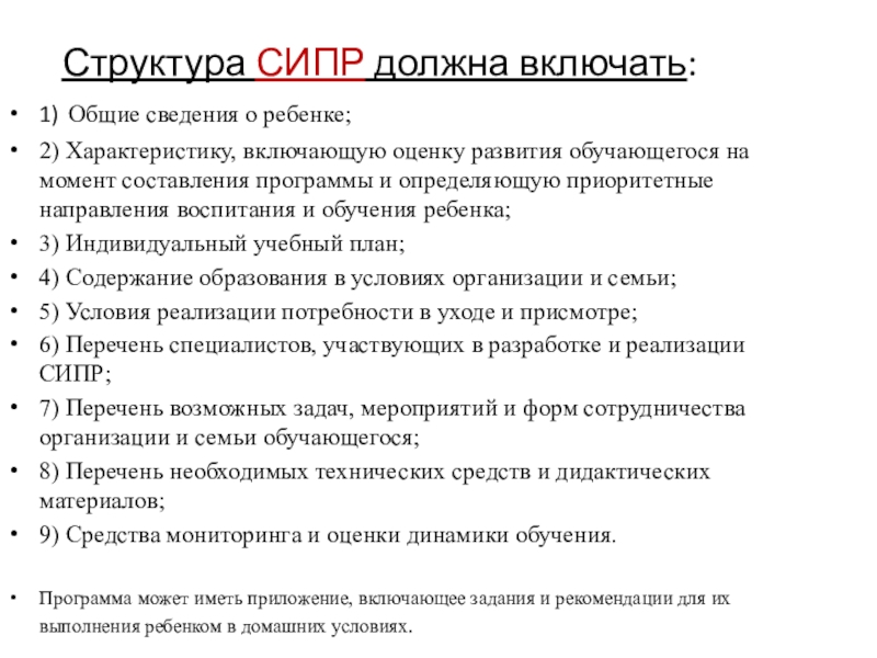 Программа может иметь приложение, включающее задания и рекомендации для их выполнения ребенком в домашних условиях.