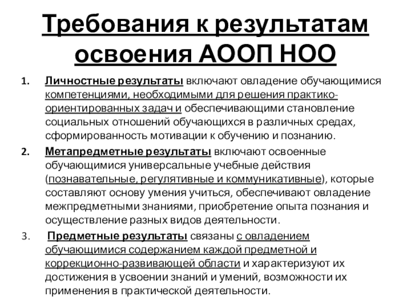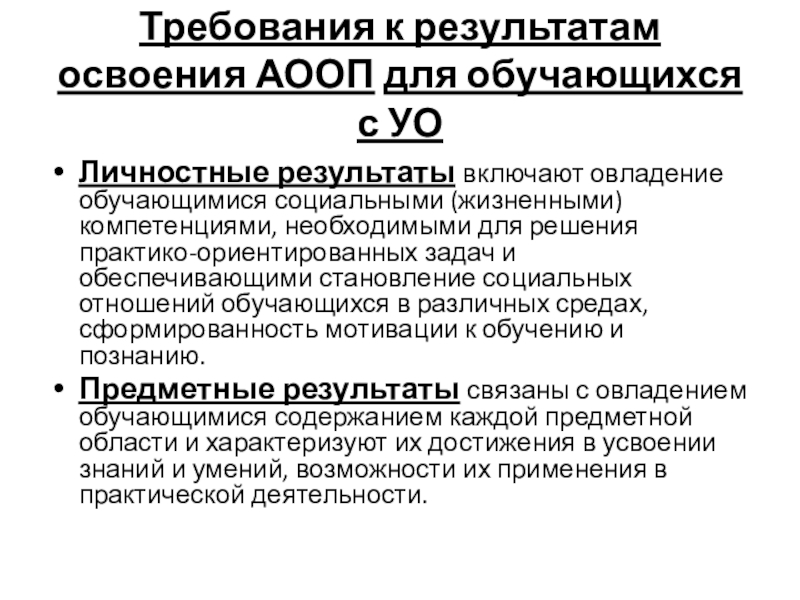 Слайд 60Требования к результатам освоения АООП для обучающихся с УО