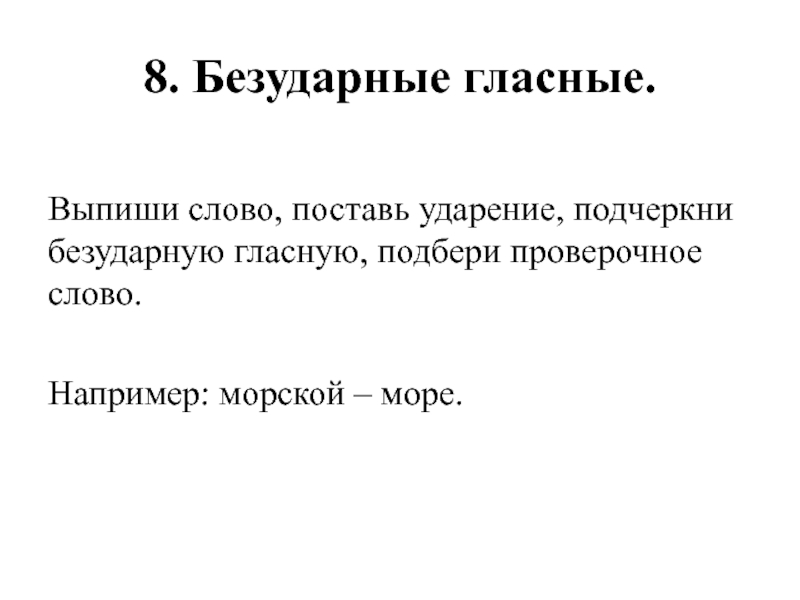 Выпиши слово, поставь ударение, подчеркни безударную гласную, подбери проверочное