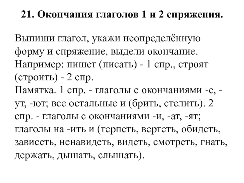 Памятка. 1 спр. - глаголы с окончаниями -е, -ут, -ют; все остальные и (брить, стелить). 2 спр. - глаголы с окончаниями -и, -ат, -ят; глаголы на -ить и (терпеть, вертеть, обидеть, зависеть, ненавидеть, видеть, смотреть, гнать, держать, дышать, слышать).