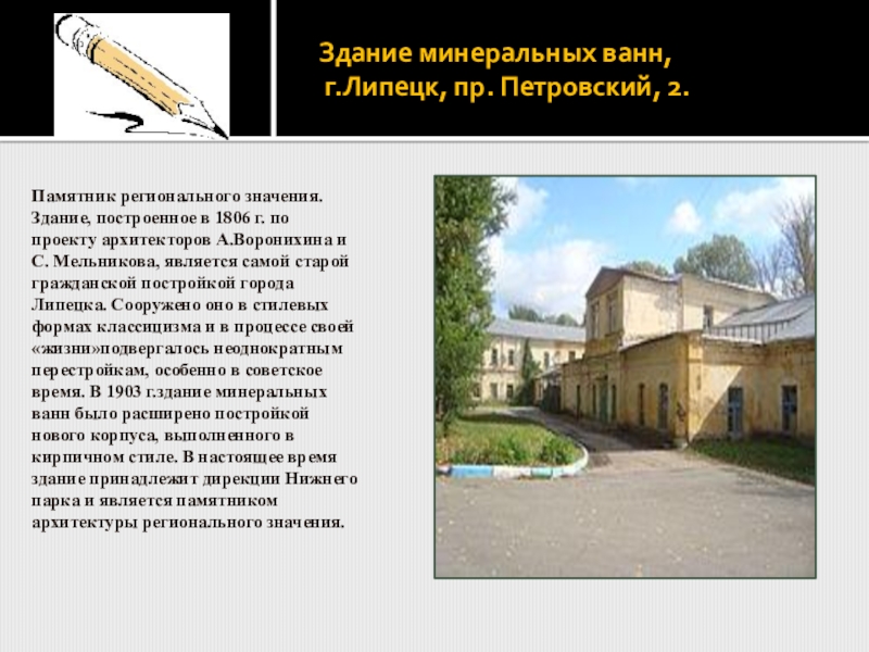 в 1806 г. по проекту архитекторов А.Воронихина и С. Мельникова, является самой старой гражданской постройкой города Липецка. Сооружено оно в стилевых формах классицизма и в процессе своей «жизни»подвергалось неоднократным перестройкам, особенно в советское время. В 1903 г.здание минеральных ванн было расширено постройкой нового корпуса, выполненного в кирпичном стиле. В настоящее время здание принадлежит дирекции Нижнего парка и является памятником архитектуры регионального значения.
