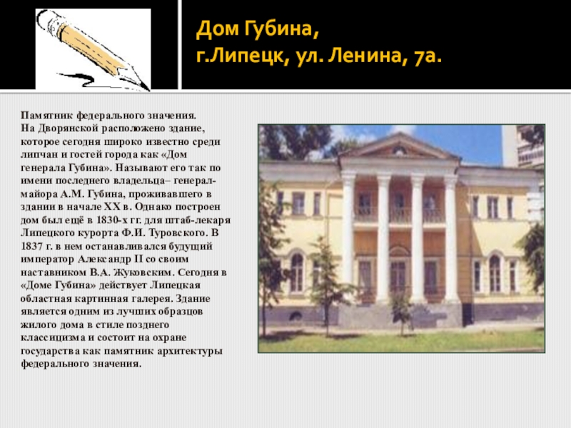 которое сегодня широко известно среди липчан и гостей города как «Дом генерала Губина». Называют его так по имени последнего владельца– генерал-майора А.М. Губина, проживавшего в здании в начале XX в. Однако построен дом был ещё в 1830-х гг. для штаб-лекаря Липецкого курорта Ф.И. Туровского. В 1837 г. в нем останавливался будущий император Александр II со своим наставником В.А. Жуковским. Сегодня в «Доме Губина» действует Липецкая областная картинная галерея. Здание является одним из лучших образцов жилого дома в стиле позднего классицизма и состоит на охране государства как памятник архитектуры федерального значения.