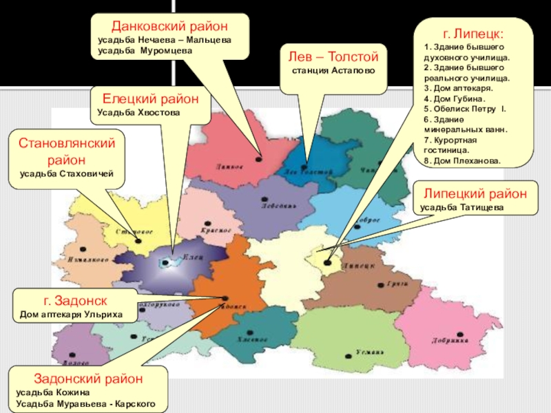 района находится усадьба Знаменское – памятник федерального значения, принадлежавшая в XVIII – начале XIX в. дворянам Татищевым и Кожиным. При гвардии ротмистре Якове Афанасьевиче Татищеве, сыне любимого денщика императора Петра I, началось формирование усадебного комплекса. Им в 1768-1784 гг. была построена каменная церковь во имя Знамения Пресвятой Богородицы в оригинальном псевдоготическом стиле по проекту великого русского зодчего В.И. Баженова. Сохранившийся и восстанавливаемый сегодня храм по праву считается выдающимся памятником архитектуры и настоящей жемчужиной Липецкого края.