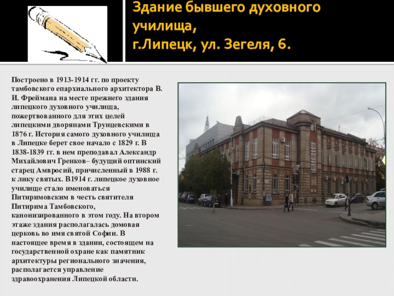 гг. по проекту тамбовского епархиального архитектора В.И. Фреймана на месте прежнего здания липецкого духовного училища, пожертвованного для этих целей липецкими дворянами Трунцевскими в 1876 г. История самого духовного училища в Липецке берет свое начало с 1829 г. В 1838-1839 гг. в нем преподавал Александр Михайлович Гренков– будущий оптинский старец Амвросий, причисленный в 1988 г. к лику святых. В1914 г. липецкое духовное училище стало именоваться Питиримовским в честь святителя Питирима Тамбовского, канонизированного в этом году. На втором этаже здания располагалась домовая церковь во имя святой Софии. В настоящее время в здании, состоящем на государственной охране как памятник архитектуры регионального значения, располагается управление здравоохранения Липецкой области.