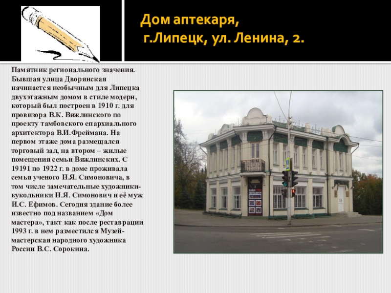 начинается необычным для Липецка двухэтажным домом в стиле модерн, который был построен в 1910 г. для провизора В.К. Вяжлинского по проекту тамбовского епархиального архитектора В.И.Фреймана. На первом этаже дома размещался торговый зал, на втором – жилые помещения семьи Вяжлинских. С 19191 по 1922 г. в доме проживала семья ученого Н.Я. Симоновича, в том числе замечательные художники-кукольники Н.Я. Симонович и её муж И.С. Ефимов. Сегодня здание более известно под названием «Дом мастера», такт как после реставрации 1993 г. в нем разместился Музей-мастерская народного художника России В.С. Сорокина.