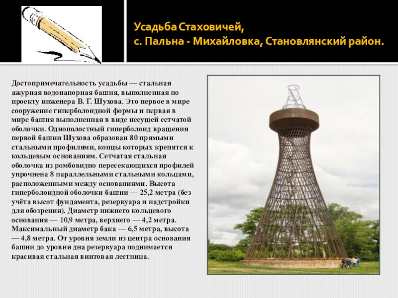 ажурная водонапорная башня, выполненная по проекту инженера В. Г. Шухова. Это первое в мире сооружение гиперболоидной формы и первая в мире башня выполненная в виде несущей сетчатой оболочки. Однополостный гиперболоид вращения первой башни Шухова образован 80 прямыми стальными профилями, концы которых крепятся к кольцевым основаниям. Сетчатая стальная оболочка из ромбовидно пересекающихся профилей упрочнена 8 параллельными стальными кольцами, расположенными между основаниями. Высота гиперболоидной оболочки башни — 25,2 метра (без учёта высот фундамента, резервуара и надстройки для обозрения). Диаметр нижнего кольцевого основания — 10,9 метра, верхнего — 4,2 метра. Максимальный диаметр бака — 6,5 метра, высота — 4,8 метра. От уровня земли из центра основания башни до уровня дна резервуара поднимается красивая стальная винтовая лестница.