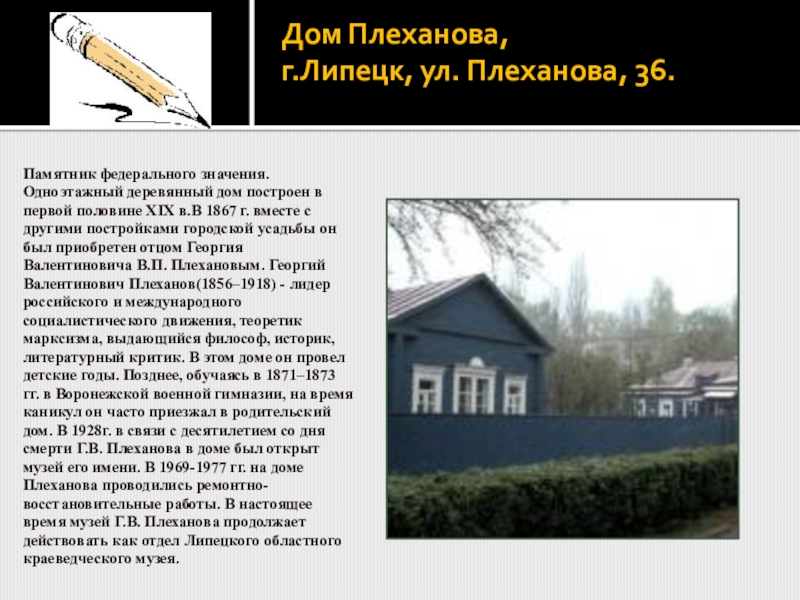 первой половине XIX в.В 1867 г. вместе с другими постройками городской усадьбы он был приобретен отцом Георгия Валентиновича В.П. Плехановым. Георгий Валентинович Плеханов(1856–1918) - лидер российского и международного социалистического движения, теоретик марксизма, выдающийся философ, историк, литературный критик. В этом доме он провел детские годы. Позднее, обучаясь в 1871–1873 гг. в Воронежской военной гимназии, на время каникул он часто приезжал в родительский дом. В 1928г. в связи с десятилетием со дня смерти Г.В. Плеханова в доме был открыт музей его имени. В 1969-1977 гг. на доме Плеханова проводились ремонтно-восстановительные работы. В настоящее время музей Г.В. Плеханова продолжает действовать как отдел Липецкого областного краеведческого музея.