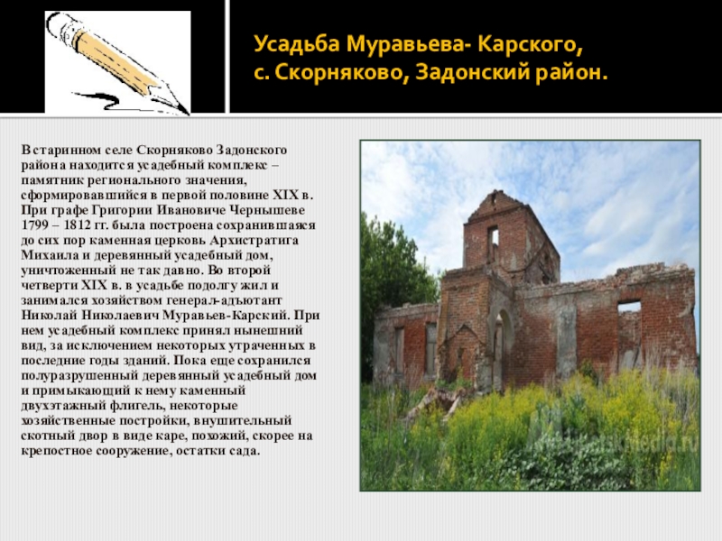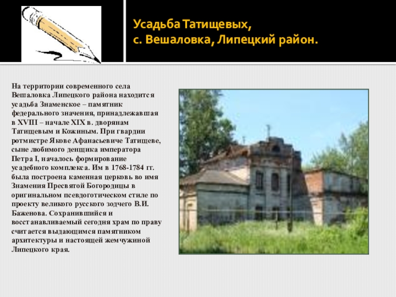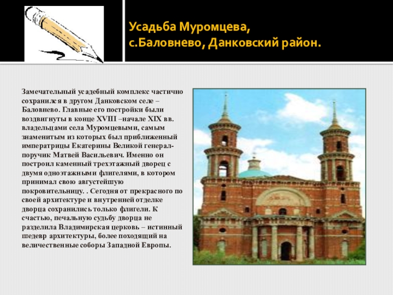 Данковском селе – Баловнево. Главные его постройки были воздвигнуты в конце XVIII –начале XIX вв.владельцами села Муромцевыми, самым знаменитым из которых был приближенный императрицы Екатерины Великой генерал-поручик Матвей Васильевич. Именно он построил каменный трехэтажный дворец с двумя одноэтажными флигелями, в котором принимал свою августейшую покровительницу. . Сегодня от прекрасного по своей архитектуре и внутренней отделке дворца сохранились только флигели. К счастью, печальную судьбу дворца не разделила Владимирская церковь – истинный шедевр архитектуры, более походящий на величественные соборы Западной Европы.
