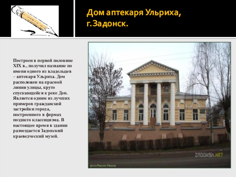 по имени одного из владельцев – аптекаря Ульриха. Дом расположен на красной линии улицы, круто спускающейся к реке Дон. Является одним из лучших примеров гражданской застройки города, построенного в формах позднего классицизма. В настоящее время в здании размещается Задонский краеведческий музей.
