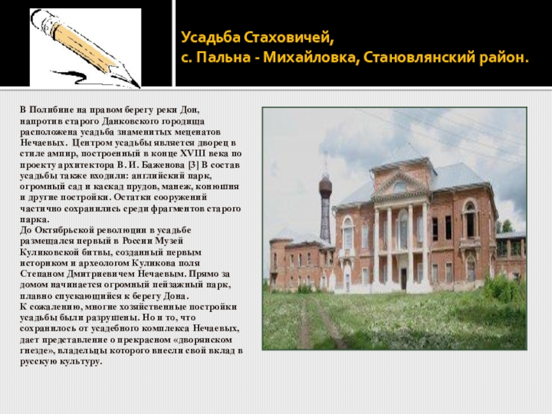 берегу реки Дон, напротив старого Данковского городища расположена усадьба знаменитых меценатов Нечаевых. Центром усадьбы является дворец в стиле ампир, построенный в конце XVIII века по проекту архитектора В. И. Баженова [3] В состав усадьбы также входили: английский парк, огромный сад и каскад прудов, манеж, конюшня и другие постройки. Остатки сооружений частично сохранились среди фрагментов старого парка.