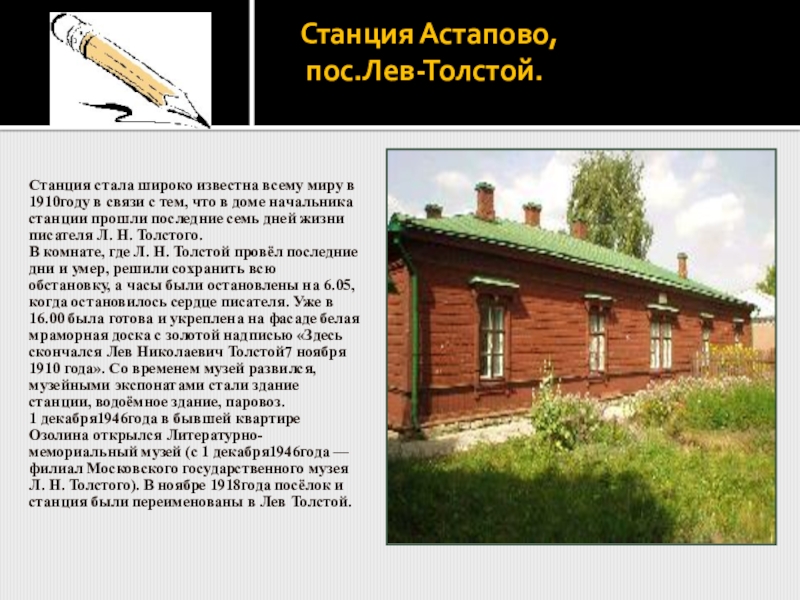 связи с тем, что в доме начальника станции прошли последние семь дней жизни писателя Л. Н. Толстого.